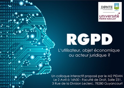 | Colloque des M2 PIDAN en partenariat avec le DANTE - "RGPD : l'utilisateur, d'objet économique à acteur juridique" 2 avril 2019 Le M2 PIDAN organise son colloque dédié au RGPD à destination des étudiants de la Faculté, du personnel administratif et de toute personne de l'Université intéressée. | |