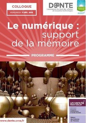 | Le numérique : support de la mémoire 11 décembre 2015 Le laboratoire de droit des affaires et des nouvelles technologies (D@NTE) de la Faculté de droit et de science politique de l'UVSQ vous invite à ce colloque d'envergure internationale. | |