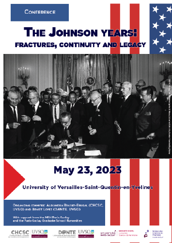 | Journée d'étude "Les années Johnson : ruptures, continuités et héritage" 23 mai 2023 Le 23 mai se tiendra la journée d'étude "Les années Johnson : ruptures, continuités et héritage" organisée par Alexandra Boudet-Brugal, CHCSC UVSQ et Benoît Lopez, DANTE UVSQ avec le soutien de la MSH Paris-Saclay et de la Graduate School Humanités-Sciences du patrimoine. | |